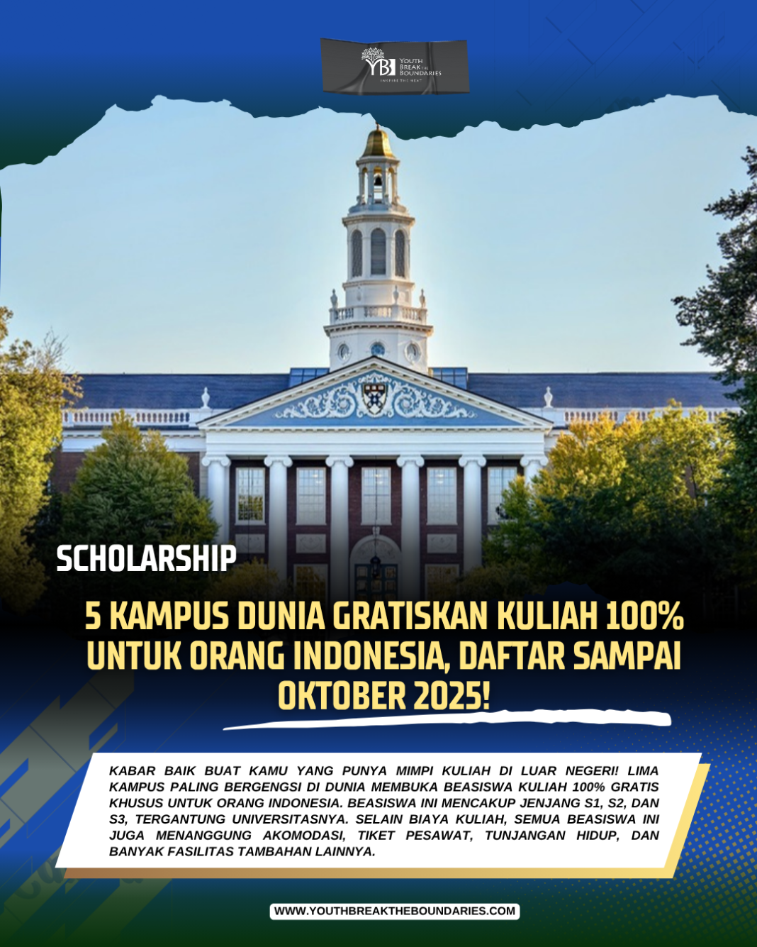 Kabar baik buat kamu yang punya mimpi kuliah di luar negeri! Lima kampus paling bergengsi di dunia membuka beasiswa kuliah 100% gratis khusus untuk orang Indonesia.