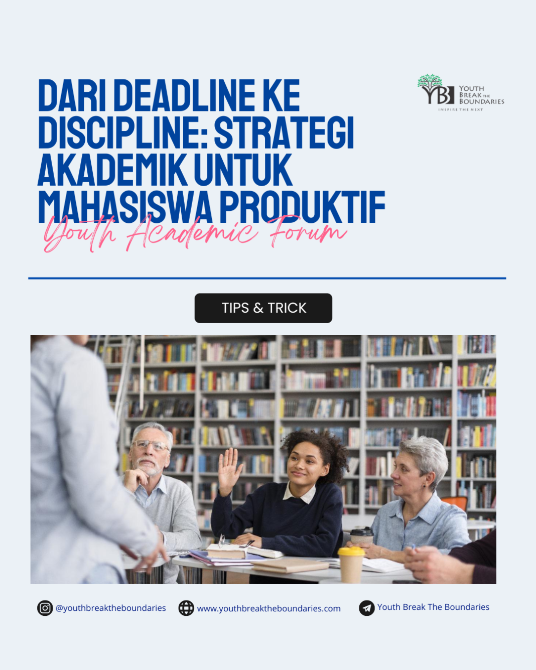 Salah satu wadah yang bisa kamu ikuti adalah Youth Academic Forum (YAF), program yang akan segera hadir dari organisasi Youth Break the Boundaries (YBB). Program ini dirancang untuk membekali mahasiswa dengan wawasan dan strategi praktis dalam membangun disiplin akademik serta meningkatkan produktivitas belajar.