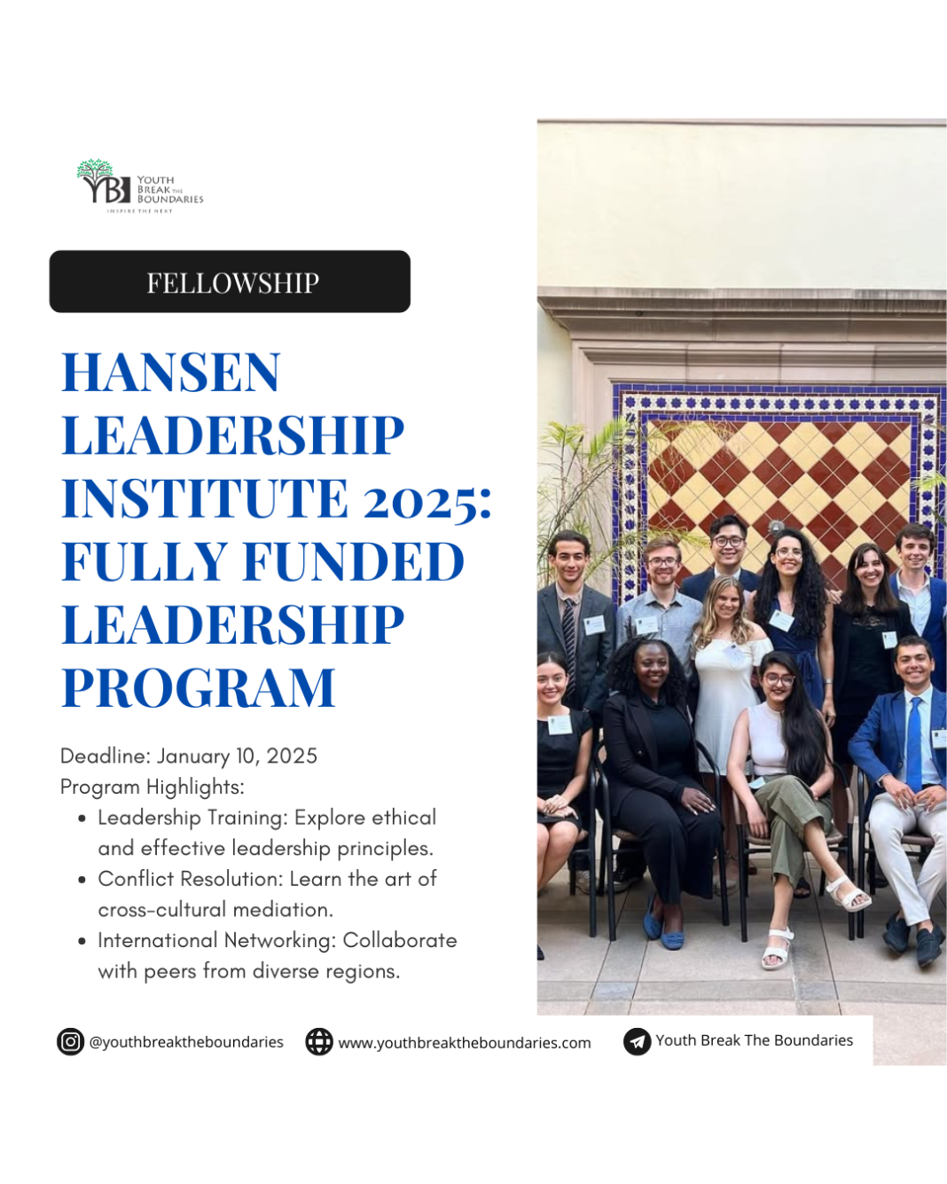 This prestigious program, funded by the Fred J. Hansen Foundation, is open to undergraduate and graduate students. Participants will learn essential leadership skills, engage in cultural exchanges, and collaborate with peers from around the world.