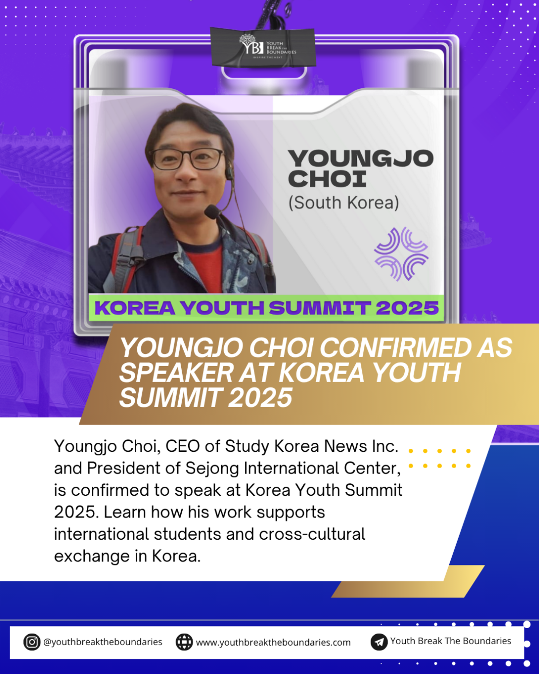Youngjo Choi has officially been confirmed as a speaker at Korea Youth Summit 2025, hosted by Youth Break the Boundaries (YBB) in Seoul. He brings decades of experience in international exchange, cultural diplomacy, and student development.