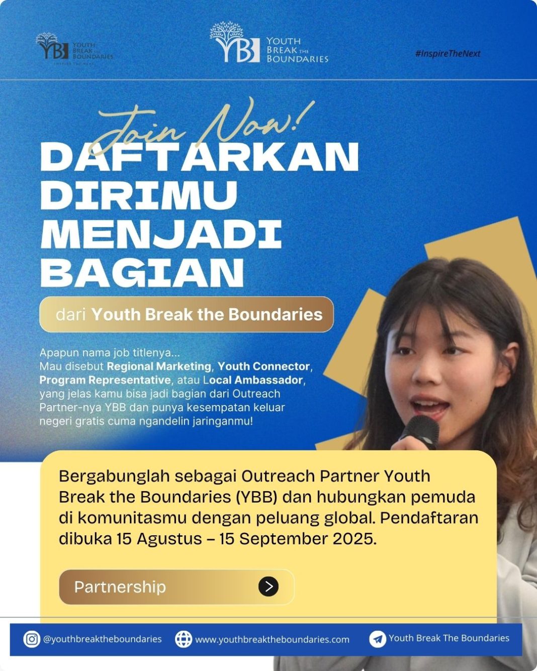 Kamu aktif di komunitas pemuda, jadi Local Ambassador, atau punya jaringan luas sebagai Youth Connector? Sekarang adalah kesempatanmu untuk membawa komunitasmu ke panggung internasional. Youth Break the Boundaries (YBB) membuka peluang menjadi Outreach Partner untuk menghubungkan generasi muda dengan berbagai program global yang bermakna.
